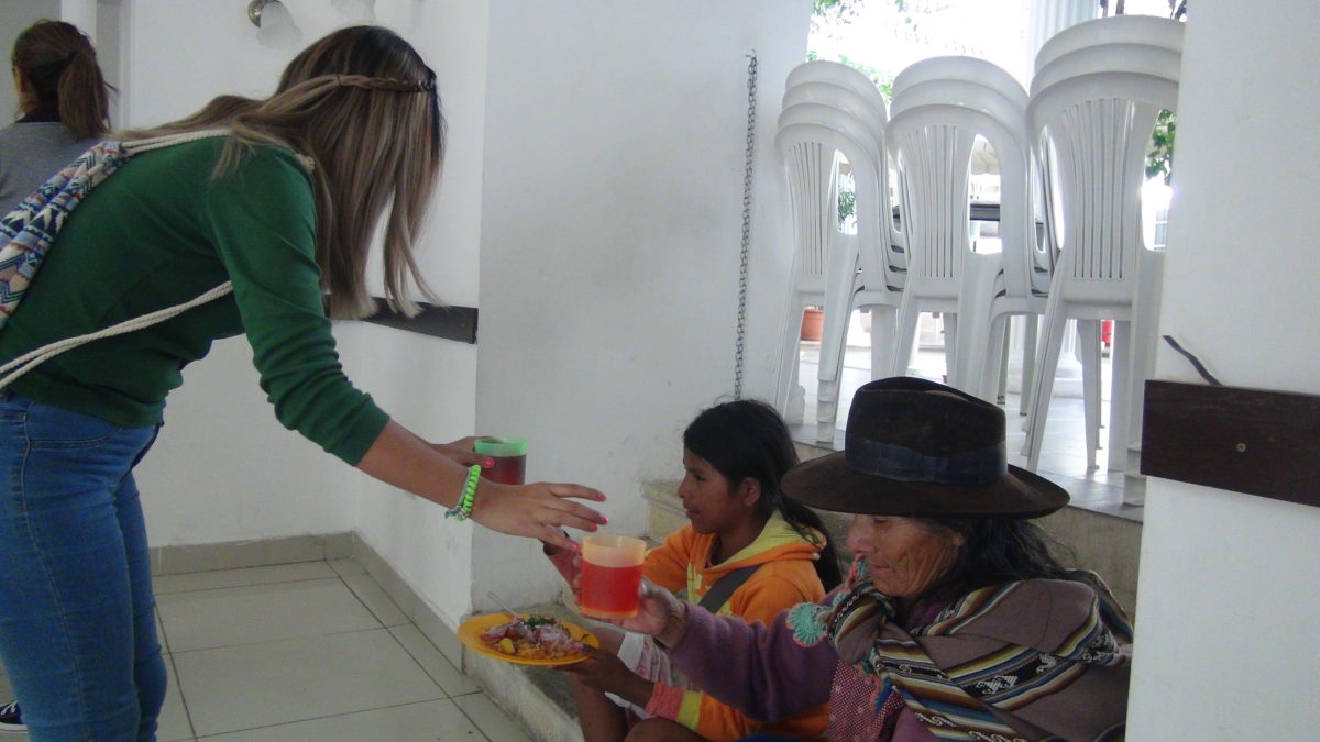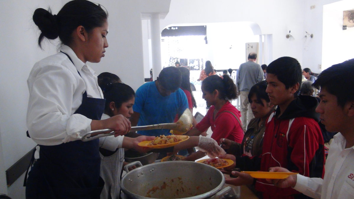Arquidiócesis de Sucre 24.04.18//CENACOM// Alrededor de 150 personas de bajos recursos, entre ellos niños canillitas, lustra botas, ambulantes de dulces, etc. acuden al comedor popular San Cristóbal después de su jornada laboral los sábados en la plazuela San Francisco, en un ambiente proporcionado para este bien social por una salteñería.
