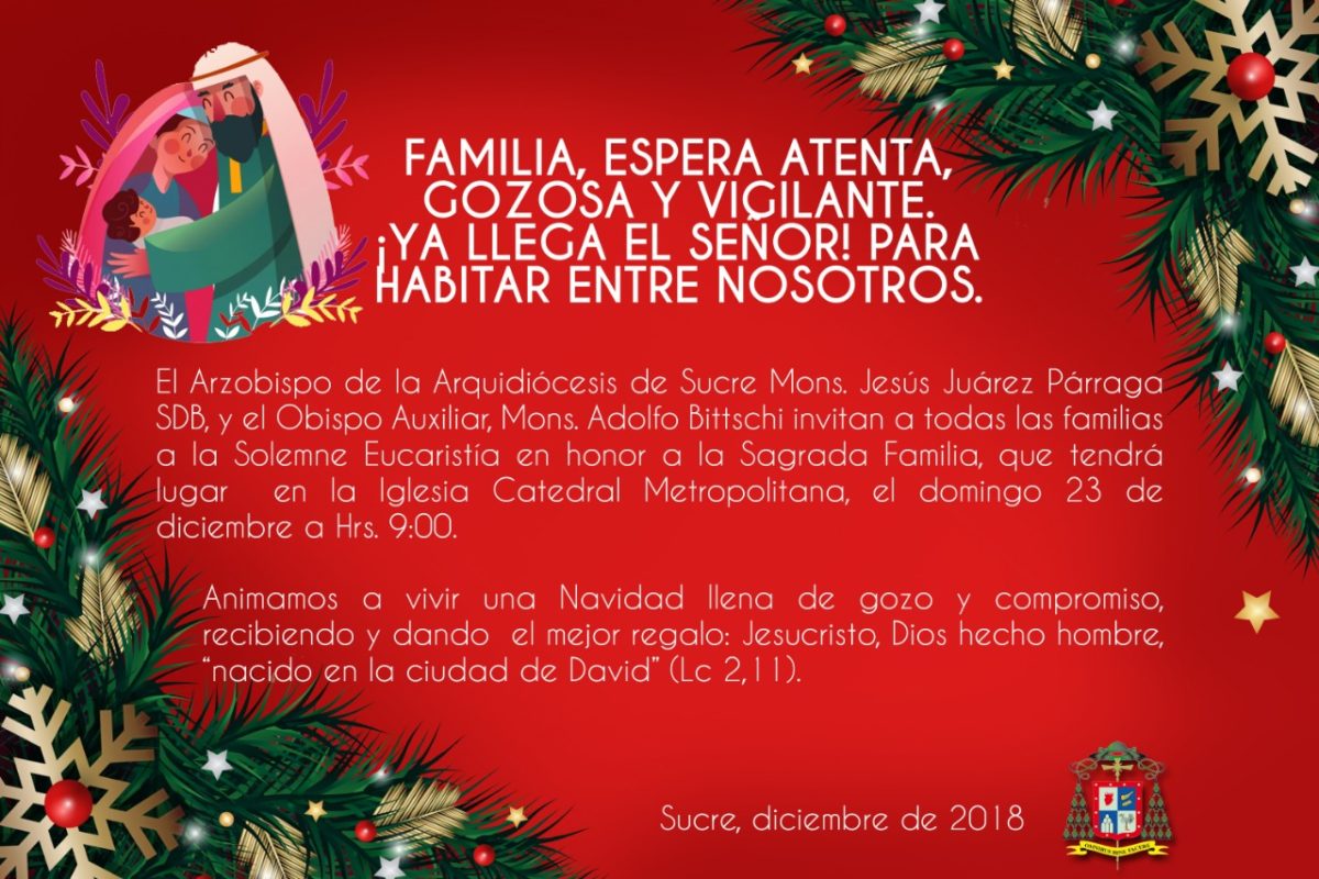 Arquidiócesis de Sucre 20.12.2018//CENACOM// El Arzobispo de la arquidiócesis de Sucre Monseñor Jesús Juárez Párraga y el Obispo Auxiliar Monseñor Adolfo Bittsch invitan a todas las familias a la Solemne Eucaristía en honor a la Sagrada Familia que tendrá lugar en la Iglesia Catedral Metropolitana el domingo 23 de diciembre a horas 9:00 a.m.