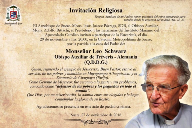 Metropolitana de Sucre por la partida a la Casa del Padre el 26 de noviembre de Monseñor Leo Schwarz Obispo Auxiliar de TREVERIS – ALEMANIA (Q.D.D.G).