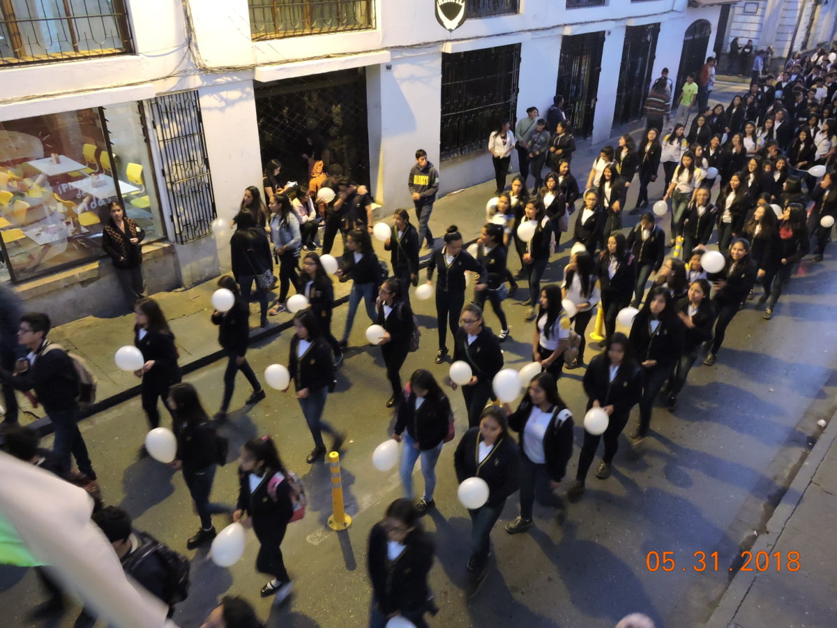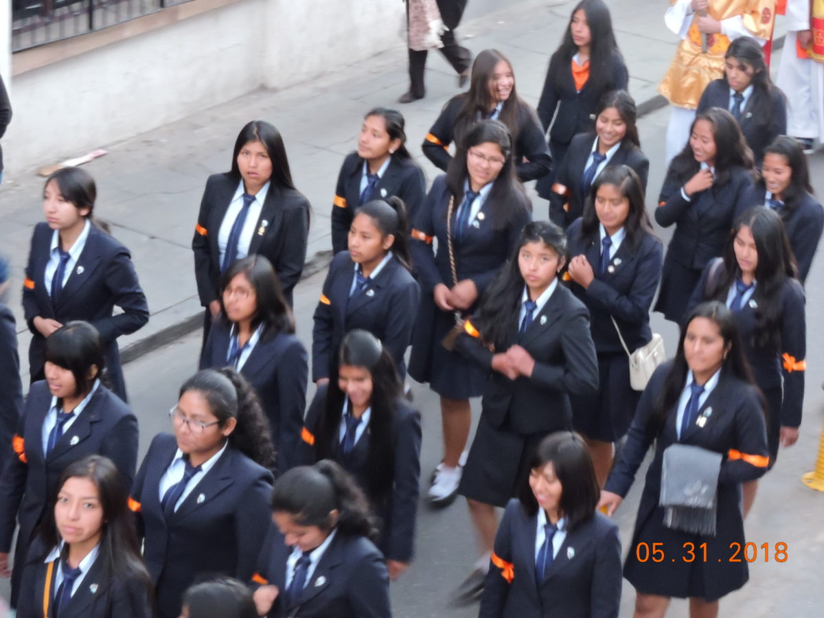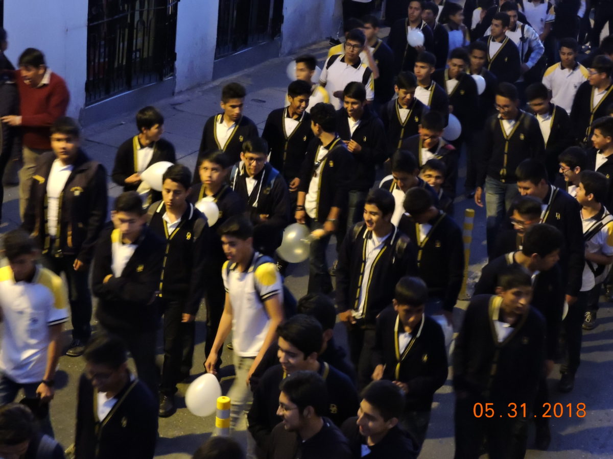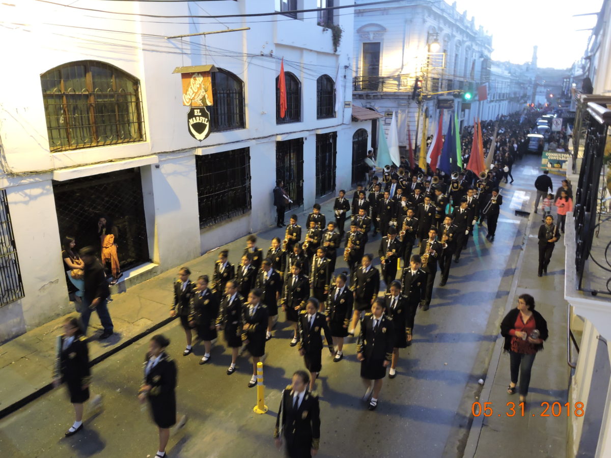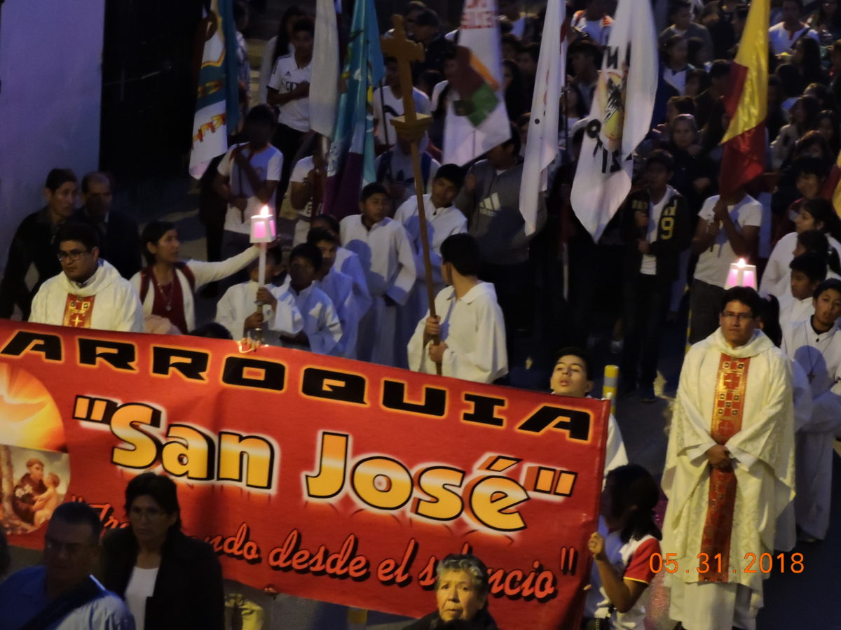 Después de la Santa Eucaristía la Cruz Misionera encabezo la masiva procesión con el Santísimo Sacramento, acompañado por las bandas y colegios participantes, Sacerdotes, Seminaristas, religiosos, religiosas, Movimientos Laicales e Instituciones Seculares.