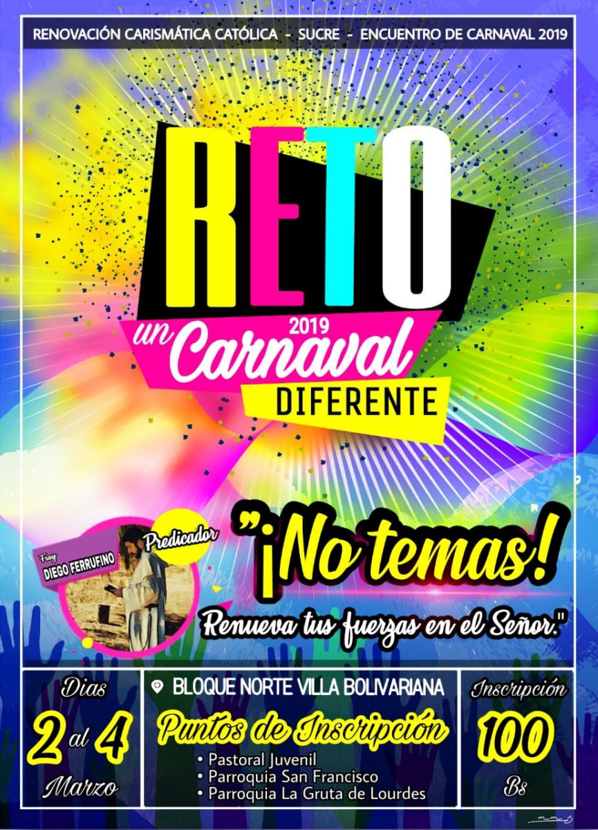 Arquidiócesis de Sucre 20.02.2019//CENACOM// La Renovación Carismática Católica de la ciudad de Sucre hace extensiva su invitación al Encuentro denominado RETO 2019 ¡No temas! “Renueva tus fuerzas en el Señor”, durante los días de Carnaval del 2 al 4 de marzo el evento se llevará a cabo en instalaciones de la Villa Bolivariana, Bloque Norte, contaremos con la presencia de Fray Diego Ferrufino como predicador principal, diacono miembro de la Orden de predicadores Domínicos.